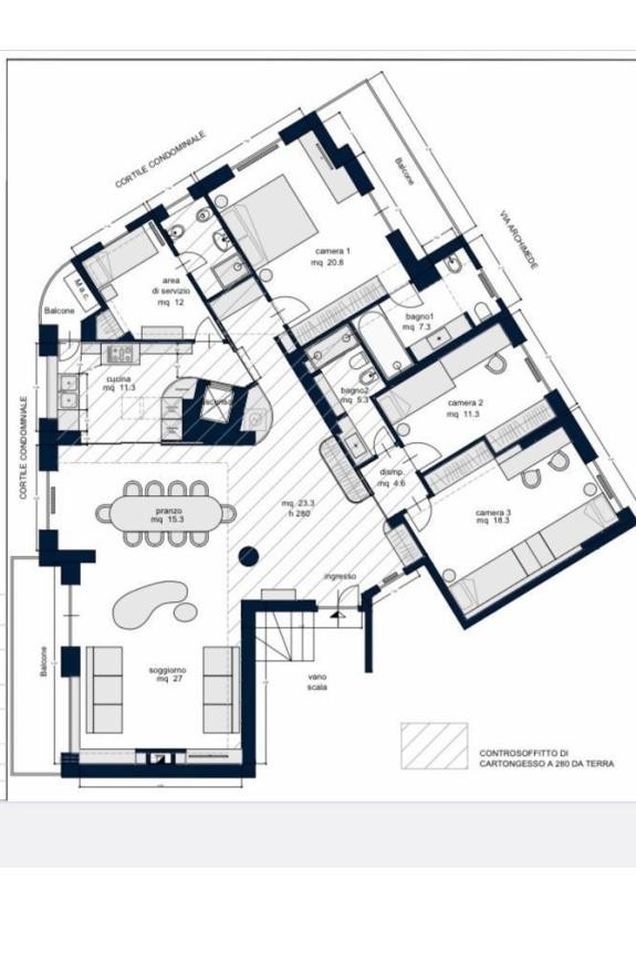In Via Archimede, al terzo piano di un palazzo signorile con servizio di portineria ed ascensore, proponiamo un appartamento di circa 160 metri quadrati con viste panoramiche e completamente ristrutturato. L'immobile è composto da un grande ingresso aperto sulla zona del salotto e zona pranzo. Il salotto ha un camino e l'accesso ad un piacevole balcone con vista sui giardini dell'ambasciata del Portogallo. Segue una cucina completamente attrezzata con access anche da un ascensore di servizio, un balcone di servizio, una comoda camera da letto di servizio con bagno en suite. Dal corridoio si accede ad un comodo armadio di servizio con lavatrice e spazio anche per una lavasciuga. A seguire si trova una camera da letto indipendente matrimoniale con balcone ed un bagno en suite con vasca doccia. Dall'ingresso si accede ad una zona notte autonoma con due camere da letto ed un bagno con doccia. Pavimenti in parquet, aria condizionata, infissi doppi, arredata con mobili in perfetto stato. Completano la proprietà un box auto per una macchina piccola (larghezza ingresso 1.92mt) ed una comoda cantina. Disponibile da subito. Preferenza per contratti con cedolare secca 3+2. NO ATTIVITà RICETTIVE.